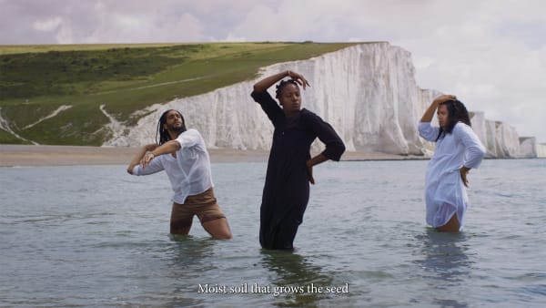 Works such as ‘And these deceitful waters’ (2023), commissioned by Frieze for the Artist Award Prize 2023, blend history, mythology and a highly poetic sensibility conveyed through the movement of dancers, the narrator’s voice and an evocative score. The work weaves together narratives, suggesting how national identity is constructed and how landscape and get co-opted into the project of nation-building.